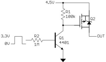 Schaltung oben sieht doch gut aus. Vorschlag: R2 mit 3,3k schaltet den npn -Transistor mit <1mA sicher duch, für Q2 reicht bei der Schaltleistung von max. 15mA auch ein billiger Standard P-channel BSS84, wenn max. 0,15V im geschalteten Zustand als Spannungsabfall an Q2 zu ertragen sind ... Sonst nen P-Channel mit niedrigerem R_dson verwenden... https://assets.nexperia.com/documents/data-sheet/BSS84.pdf