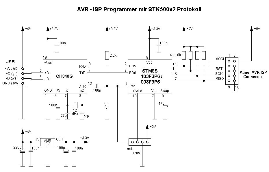 Im Verlaufe dessen, was man mit den ultra low cost Controllern STM8S103 und (noch billiger) STM8S003 anstellen kann (und was die können), habe ich das AvrUsb500 Projekt von http://tuxgraphics.org/electronics/200510/article05101.shtml für die STM8 Controller geportet. Somit steht denen, die sich mit STM8 (und STM32) beschäftigen und nur ab und zu auch einen AVR flashen wollen / müssen ein Flasher für Atmel-AVR Controller mit STK500 Protokoll zur Verfügung. Hat man bereits eine Steckbrettvariante eines USB2RS232 Adapter wie bspw.: http://www.ebay.de/itm/USB-to-TTL-Converter-UART-module-CH340G-CH340-3-3V-5V-Replace-Pl2303-CP2102-/272365785787?hash=item3f6a4412bb:g:u7EAAOSwFdtXzaMJ kann in Kombination mit dem "Minimal Experimentierboard" http://www.ebay.de/itm/Minimum-System-Development-Board-Module-ARM-STM8S103F3P6-STM8-For-Arduino-/172277353430?hash=item281c87cbd6:g:9PYAAOSwI-BWMz3N extrem preiswert ein AVR-Programmer realisiert werden. Wird der Programmer wie im Schaltbild mit Bauteilen realisiert, beträgt der Kostenaufwand (ohne Platine) kleiner einem Euro bei Verwendung eines STM8S003 (Bezug aus China). Die verwendete Toolchain ist SDCC 3.6 und das im Zip-File enthaltene Makefile setzt einen installierten SDCC voraus. Prinzipiell werden ausser einer USB2RS232 Bridge (mit TTL-Pegeln) und einem Flasher der den STM8 beschreiben kann nichts weiter benötigt. Im Bild und im Schaltplan ist allerdings mein Steckbrettaufbau gezeigt, der einen einzelnen CH340G als USB2RS232 verwendet. Der STM8 Controller kann auch mit meinem Bootloader aus Beitrag "Re: Serial Bootloader für STM8S103F3P6 (Linux)" beschrieben werden. Hier ist dann im Makefile die Zeile FLASHERPROG = 0 nach FLASHERPROG = 2 zu ändern. Die Übertragungsbaudrate beträgt 57600 Baud. ---------------------------------------------------------------- Ausgabe des Programmers in Verbindung mit AVRDUDE ----------------------------------------------------------------
