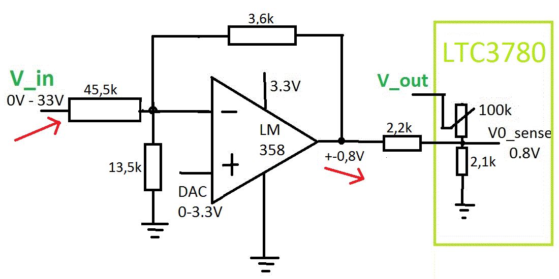 Ach Leute ich doof. Weiß nicht wirklich wie ich den OP vom LM358 beschalten soll. Möchte aus dem 97% Wirkungsgrad LTC3780 step-up step-down (Vollbrücke) einen mppt-Solarregler machen. Das 14A LTC3780 Modul wird aber nur über 100k Poti von der Ausgangsspannung geregelt. Also steigt V_out, dann steigt am V0_Sense die Spannung über 0,8 Volt und der LTC regelt die Leistung runter. Für mppt muss aber die Eingangsspannung geregelt werden. Und zwar umgekehrt. Also wenn V_in sinkt, dann muss die Konverterleistung reduziert werden, damit das Solarmodul gegen Leerlaufspannung geht - also V_in wieder ansteigt. Also mit einem Operationsverstärker einen invertierenden Verstärker, der einfach auch auf V0_sense wirkt. Sinkt dann V_in, wird V0_sense hoch gezogen, der LTC denkt dass muss an einer höhren V_out liegen und regelt die Leistung runter :-) Hab mit Potis als Widerständen mal die Schaltung mit einem LM358 zusammengesteckt. Ja so ein paar mV läuft OUT auch entgegen V_in = 14-18 Volt. Aber ich finde keine Widerstandswerte die 1. OUT um 0,8 Volt verteilen. 2. gewünscht 0,7 - 0,9 Volt durch IN+ = 0 - 3,3V variieren. Also ich will dann mit ESP8266 per I2C und DAC IN+ zwischen 0 und 3,3 Volt regeln und so V_in am LTC einstellen. Aber ich halt doof und nix Ahnung von Operationsverstärkern. Vielleicht mag mir jemand sagen wie ich das Ding verschalten muss, liebwink :-)