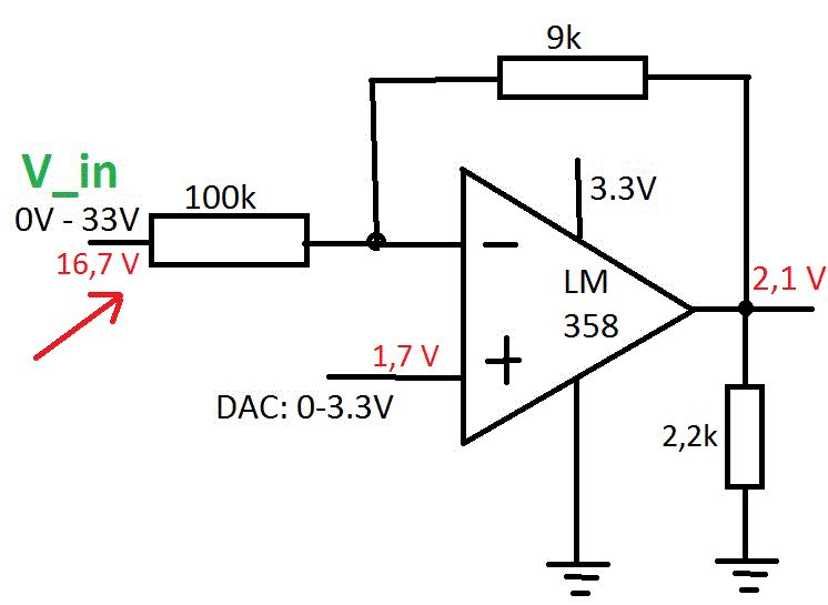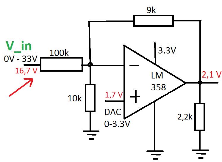 Naja du schiebst auf dem LM358 16V-33V obwohl der nur 3,3V als Betriebspannung hat damit übersteuerst du die Eingänge. Wenn du ein Spannungsteiler so wählst das darüber 33V = 2,5V werden sollte es klappen. Denk dran das der LM358 nicht 100% an VCC(3,3V) und GND(0V) gesteuert werden kann.