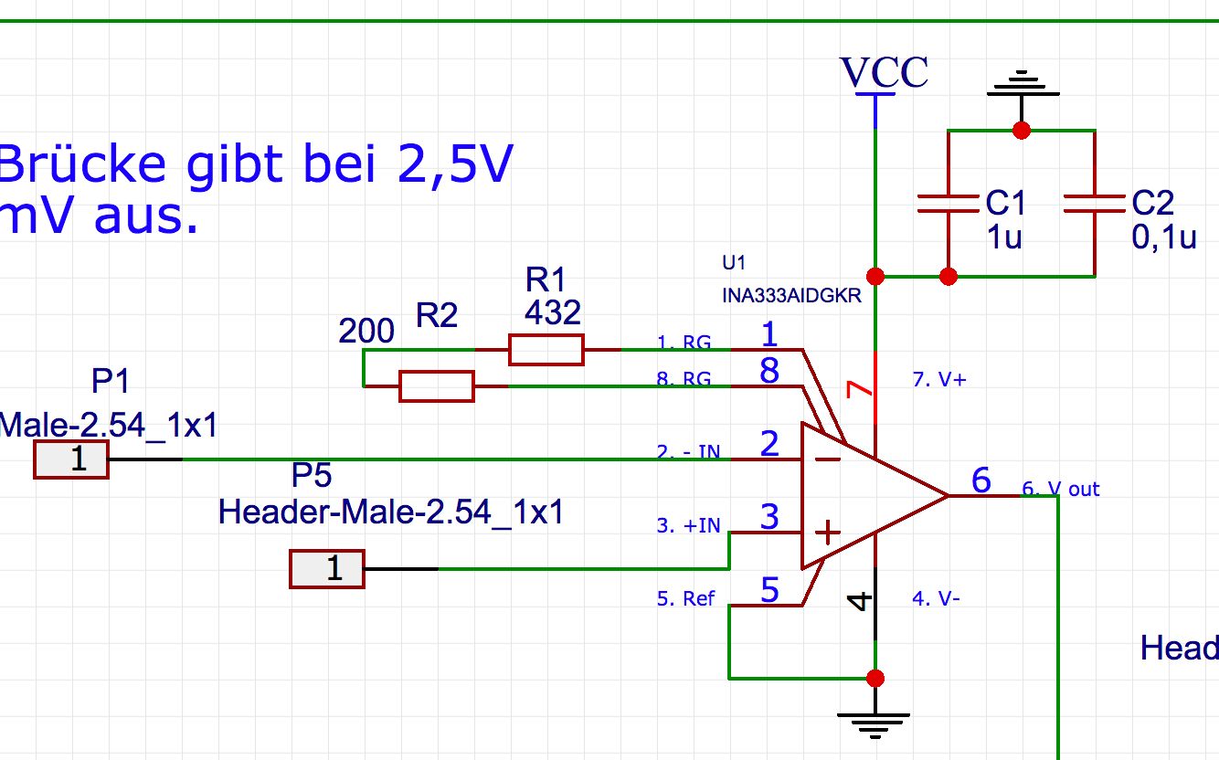 Hallo Liebes Forum, ich hab einen INA333 In-Amp in einer kleinen Schaltung verbaut. Eigentlich wollte ich eine Verstärkung von knapp 160 erreichen, aber wenn ich das ganze jetzt anschliesse kommt eine Verstärkung von 2 raus. Den Widerstand bei RG hab ich gemessen (632 Ohm). Für die Verstärkung steht im Datenblatt G=1+100kOhm/RG. Davor hatte ich das ganze auch mal bei TINA TI aufgezeichnet und es kam raus was ich wollte. Ich hab eigentlich nichts mit Elektronik am Hut also ist die Wahrscheinlichkeit gross dass ich einen Fehler gemacht habe. Vielleicht sieht jemand auf anhieb wo der Hund begraben ist. Bin für jede Hilfe dankbar. Danke und LG Daniel