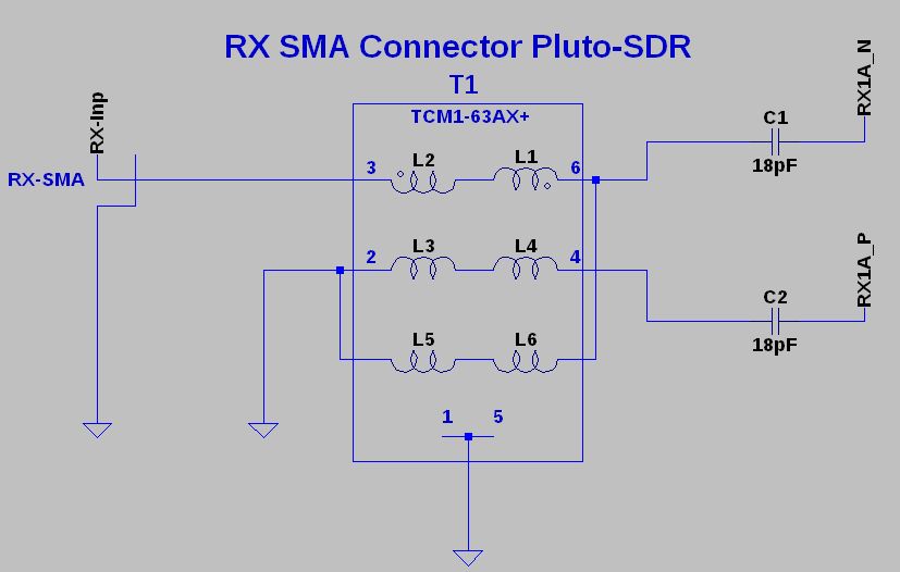 @Omega G. Danke für den Hinweis zu dem Eingangsübertrager. Laut Schema sieht der Eingang des RX's wie in der angehängten LT-Spice Darstellung aus. Auszug aus dem Schematic wollte ich nicht posten. Mann weiß ja heute kaum, was noch erlaubt ist. Die Übertrager eignen sich für den Bereich 10-6000MHz. Wie weit ist es möglich den AD9363 herunter zu tunen. Laut DS bis 325MHz laut SDRangel Programm bis 70MHz. Sind die 70MHz der IIO-Lib geschuldet und es ginge noch etwas mehr, wenn man die richtigen Controll-Sequenzen schicken würde? Die 18pF am Eingang haben bei 70MHz bereits etwas über 120 Ohm an Widerstand. Markus