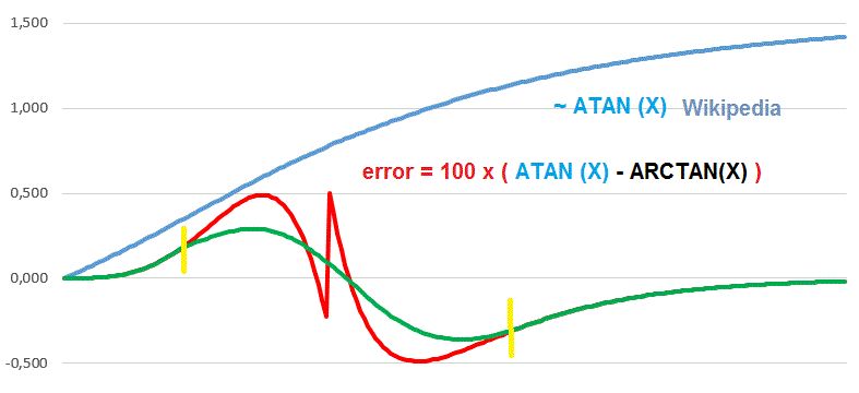 W.S. schrieb: > Was ist denn mit einer stückweisen quadratischen Annäherung? Geht beschissen, wegen der horizontalen Asymptote. Man muss in ewig viele Teilintervalle zerlegen. (Gut... ich hatte kubische Splines betrachtet. Macht keinen großen Unterschied in der Kernaussage.) > Etwas > rechnen können, wird auch der winzigste Winzigkontrolleur. Ein alter Vorschlag von gjlayde sagt, für Winkel über 45° die Beziehung atan(1/x) = 90 - atan(x) auszunutzen. Das ist clever, setzt aber effiziente Berechnung von 1/x voraus.