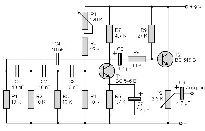 Siehe Nachbarthread: Astabiler Multivibrator. Die Kurve ist allerdings rechteckförmig und von niedriger Frequenz (mit bloßem Auge durch eine LED sichtbar gemacht). Damit Du sie mit einem Audioverstärker hören kannst, solltest Du die Kondensatoren verkleinern, damit die Frequenz größer wird. Wenn Du eine gebogene Kurve haben willst, kannst Du noch einen oder mehrere Tiefpässe dahinterschalten.