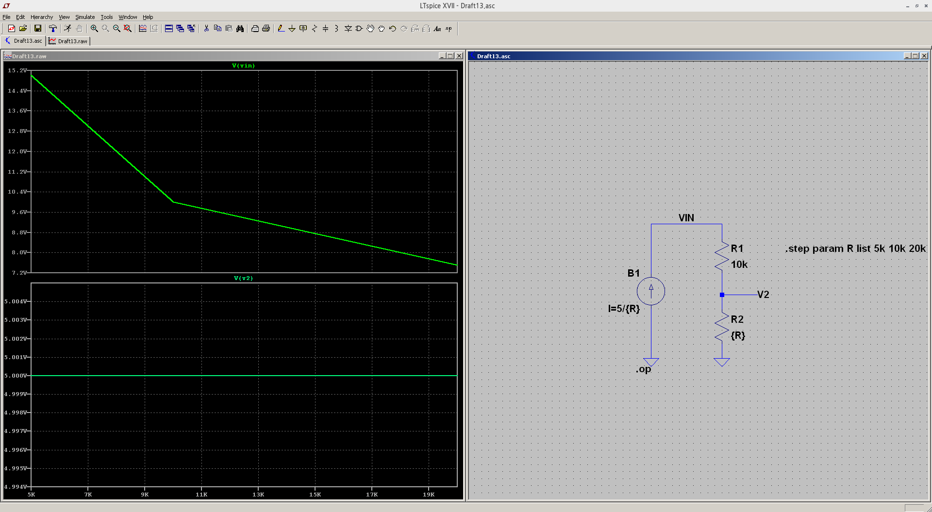Hallo, lässt sich mit Spice eine Spannung "rückwärts" berechnen? Meine Schaltung (s.u.): Spannungsteiler aus R1 und R2. R1 sei konstant, R2 variabel (steps). V_2 soll stets 5V betragen. Kann Spice die entsprechende Spannung V_IN in Abhängigkeit von R2 ermitteln und plotten? Wenn ja, wie? Besten Dank im Voraus.