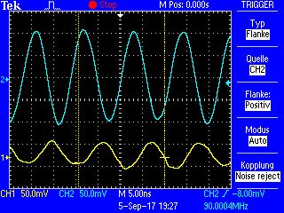 Die Anodenspannungen stimmen so etwa, kann auch nicht anders sein wenn Stromaufnahme und Vorwiderstände halbwegs passen. Die bei beiden Cs sind in Ordnung, stimmen sehr genau. Habe die Vorstufe nochmal sorgfältig bei -24dBm Eingangssignal vermessen. Um Frequenzgangfehler der Tastköpfe zu vermeiden, eine Relativmessung von Eingang zum Anzapfpunkt von L5. Die Verstimmung durch den Tastkopf ist hier gering, läßt sich außerdem leicht mit dem Dreko nachstimmen. Siehe Oszilloskopbild: gelb=Eingang, blau=L5-Anzapfung. Verstärkung ist 4, also 12 dB. Ist doch im zu erwarteten Rahmen. Der ZF Ausgang ist nicht so einfach messbar: einmal wegen des allgegenwärtigen Oszillatorsignals und weil der Ausgang sehr empfindlich auf den Tastkopf reagiert. Ist denke ist auch nicht so wichtig: gestern in meinem letzten Post hatte ich schon ein ZF-Signal bei -20dBm Eingang gezeigt, allerdings wusste ich da noch nicht dass das von der Tastspitze deutlich bedämpft/verstimmt wird. Sieht man am magischen Auge und hört man im Lautsprecher. Habe meine Behelfsantenne im Keller etwas verbessert: höre jetzt 3 UKW Sender in mäßiger Qualität. Ok, der Ratio-Elko fehlt noch. Ich denke das Thema ist erstmal durch: baue den Tuner wieder zusammen. Bevor ich den einsetzte, wird die defekte AM/UKW Antriebskupplung repariert. Wird sicher fummelig. Bis ich das Radio zusammen habe, ist sicher auch die Ersatz-ECC85 da. Glaube aber nicht das die was bringt. Der entscheidente Fehler war der Neutralisations-Kondensator C18. Gruß Holler