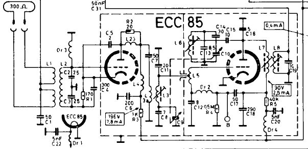 Das zweite System der ECC85 arbeitet als selbstschwingende Mischstufe. Die Oszillatorfrequenz wird von L6/C10/C13/C14 bestimmt. Wenn die Oszillatorfrequenz nicht paßt, wäre da zuerst zu prüfen. Das vom ersten System verstärkte Antennensignal wird über L5 vom Serienkreis L3/C9/C8 entnommen und dem Gitter zugeführt. Die ZF wird im Auskoppelfilter an L8/C19 entnommen und sollte am heißen Ende von L8 meßbar sein. Die angegebene Anodenspannung kann mit jedem modernen Multimeter gemessen werden. C15 ist ok?