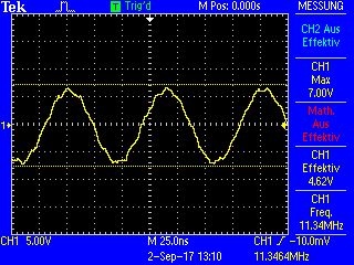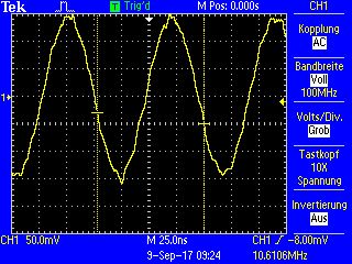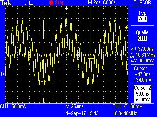 Danke für die schnellen Antworten. Soviel vorab, die Tasten können es nicht sein, wenn ich ein externes 10,7 MHz Signal einspeise geht es ja. Hatte die zuvor schon mit Elektronik-Reinigungsspray behandelt. Habe zwei Dinge ausprobiert: Radio auf 88MHz gedreht, und mit einem analogen Kofferradio unmittelbar neben dem Röhrengerät ein Oszillatorsignal um 99MHz gesucht, aber nichts gefunden. Habe langsam zwischen 95-101MHz durchgestimmt, aber fand nichts plausibles. Mit dem Meßsender 88 MHz mit -10dbm in den Antenneneingang und mit dem Oszi auf die Dreko-Platten. Auf dem einen Paket war das sehr starke 10,35MHz Signal, auf dem anderen ein schwaches 88MHz, weniger als eingespeist. Habe mich übrigens Vermessen, das waren nicht knapp 50mV sondern knapp 5V (!) Der eine Tastkopf ist wohl hin. Anbei ein Bild vom Signal: da schwingt der Tuner-Oszillator auf knapp ZF-Frequenz statt im UKW-Bereich?! Wie gesagt, eine EEC85 müsste ich erst bestellen. Neu gibts nur Vergleichstypen mit amerikanischer Bezeichnung oder irgendwelche mir nicht bekannten Hersteller (London, Ei). Sieht mir aber eher nach einem anderen Fehler aus, die Röhre schwingt ja mit ordentlichem Pegel! Holler