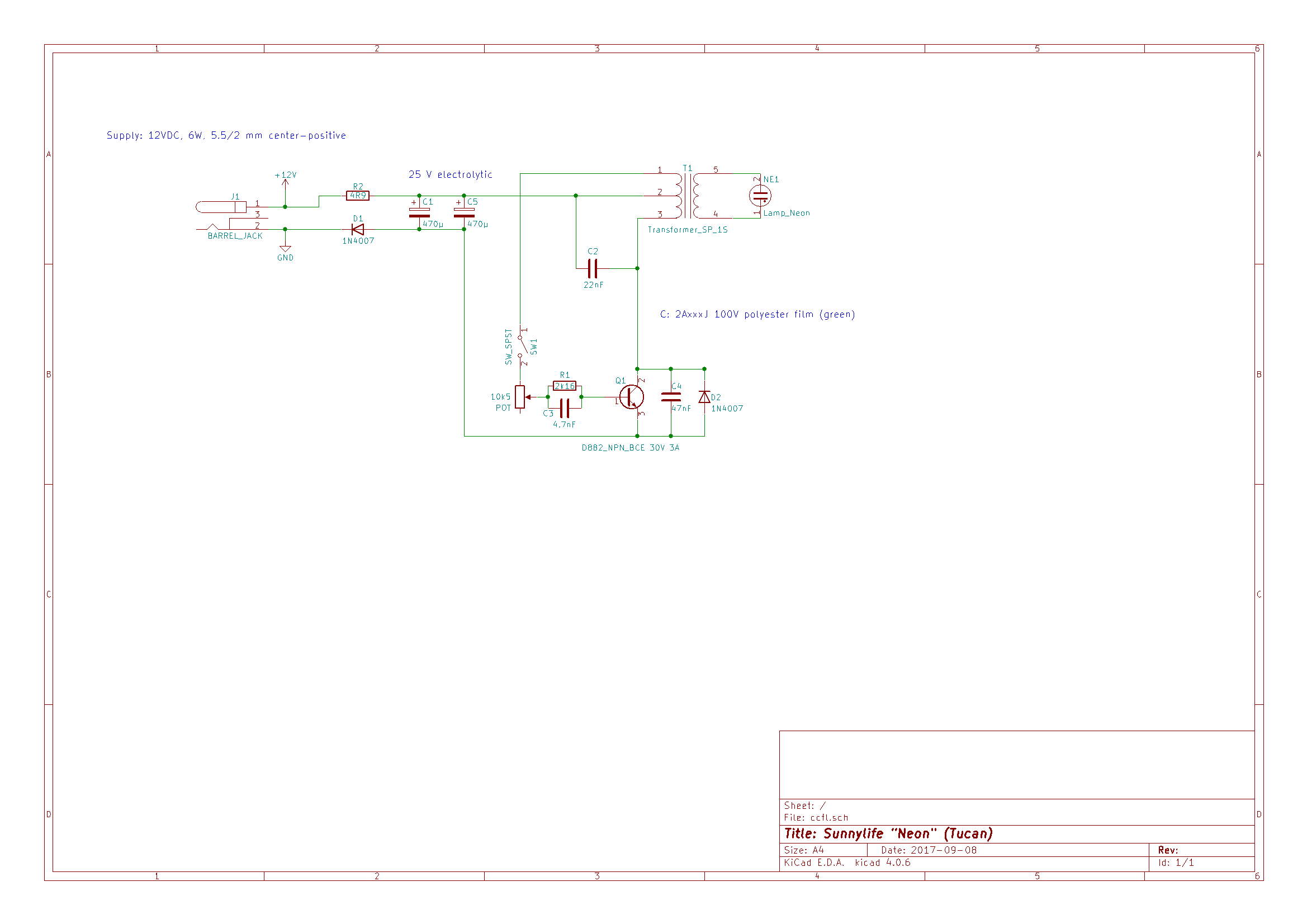 Hallo, anbei der aufgenommene Schaltplan eines HV-Netzteils zum Betrieb einer bunten Leuchtstofflampe (CCFL). Der Vorwiderstand ist ein Leistungstyp, offenbar zur Strombegrenzung (2,4 A). SW1 und POT sind kombiniert. Zum Zünden muss das Poti erst "aufgedreht" werden, dann stelle ich es meist ganz zurück, d.h. kurz vor den Schaltpunkt. Ich frage mich, ob das mit wenig Aufwand zu digitalisieren wäre, also per Mikrocontroller zu steuern (z.B. Fernbedienung). Es sieht mir nach Sperrschwinger aus, wobei ich C2-C4 ich nicht verstehe. Ist C3 frequenzbestimmend? Es sind um die 25 kHz. Ausgangsspannung im Betrieb könnten 550 VAC sein (unsichere Messung, der DMM-Spannungsteiler beeinflusst die Helligkeit). Der Basisstrom verändert also die Helligkeit. Könnte der Wandler fix mit 25 KHz und variablem Basisstrom per R2R-DAC von einem Controller betrieben werden? Die Verstärkung liegt beim vermuteten NPN (www.st.com/resource/en/datasheet/2sd882.pdf) und 2 A vielleicht bei 50, das wären 40 mA; für einen ganzen Port evtl. zu schaffen. Ich habe keine Daten zum Trafo; wäre evtl. einfach ein PWM-Betrieb möglich?