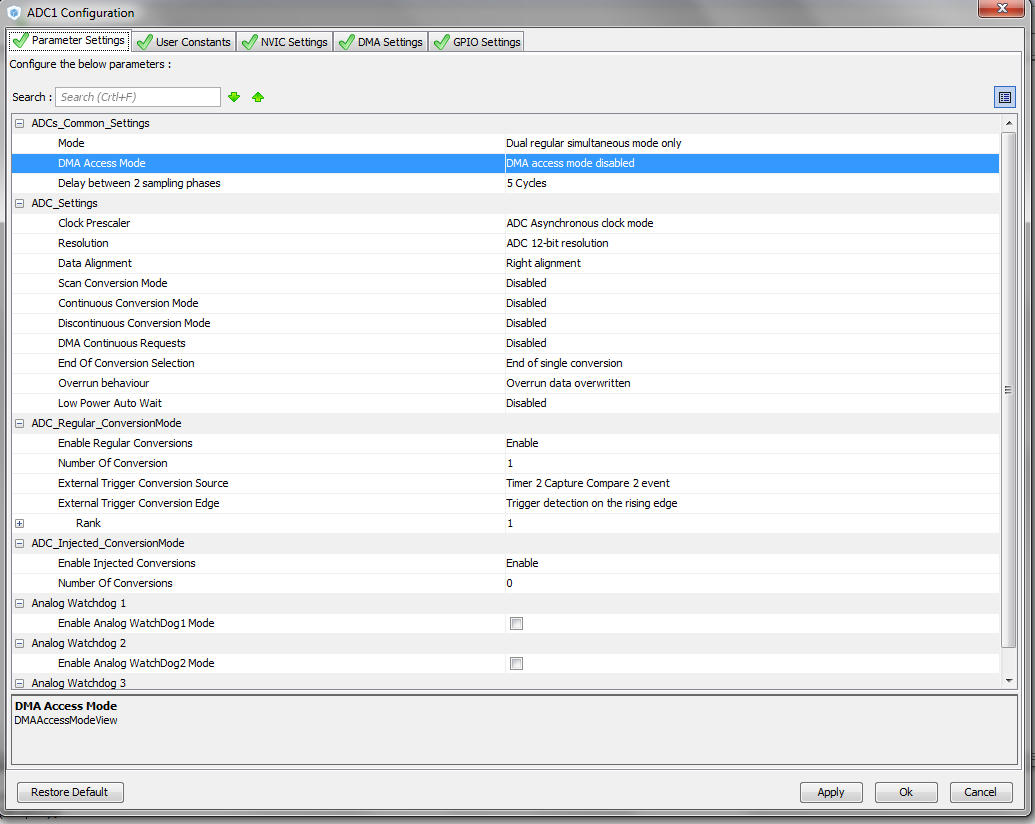 Ich habe jetzt mal den dual regular simultaneous mode aktiviert, dieser sollte eigentlich der richtige sein. Nun funktioniert aber das ganze noch nicht. Den DMA habe ich in CubeMX für beide ADC's aktiviert, doch was genau muss ich noch initialisieren? Momentan habe ich folgendes für die Initialisierung: