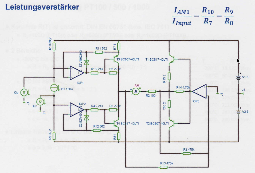 Hallo, R10 hängt an +In und R7 an -In des OPV. Der OPV hat eine sehr hohe Verstärkung und gleicht praktisch jeden Spannungsunterschied zwischen +IN und -IN aus. Dann rechne mal die Ströme der beiden Widerstände aus, die bei 0V Differenz auftreten. Dann hast Du das Verhältnis R10/R7. Das Ganze Gebilde ist ein Brückenverstärker. OP3 dreht dazu die Phase um 180°. mfg Klaus
