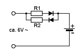 Na also, gehts nicht gleich so? Nimm halt 68 Ohm, für die Auflade-Stromrichtung und etwa 270 Ohm für die Entlade-Stromrichtung. Widerstände mit 1/4 W (übliche bedrahtete Bauform)reichen aus. Die Werte brauchen nicht genau sein, denn ob die Schaltung wirklich richtig arbeitet, entscheidet die Zusammensetzung bzw. der Aufbau der Zelle. Du wirst wahrscheinlich feststellen, dass das "Aufladen" nur sehr dürftig gelingt. Auch die Lebensdauer von 5...20 Ladungsvorgängen wird eher ein Einzelfall bleiben. Aber probiers halt aus.