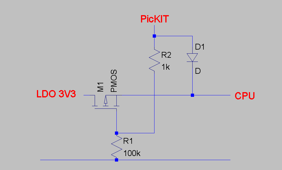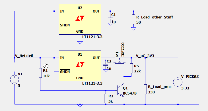 So, wie im Anhang müsste es mit jedem 3.3V-Regler gehen, der für die Simulation verwendete LT1121 hätte aber auch ohne den FET ohne Stromaufnahme eine Rückspeisung vertragen, andere ziehen aber Strom. So zumindest in der Simulation :-), wobei ich für die Betriebsart nicht unbedingt die volle Wahrheit erwarte. Der obere Regler ist für den Rest der Schaltung, der untere nur für den zu programmierenden µC. Da der 3.3V-Regler auch etwas mehr Spannung liefern könnte als der Pickit, würde in diesen gespeist werden. Daher sollte das Gerät zum Programmieren ausgeschaltet sein.