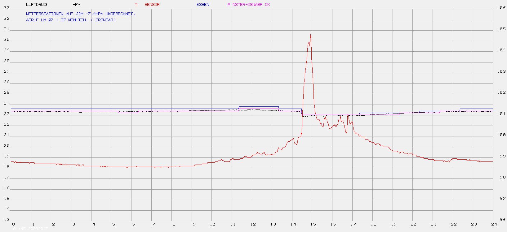 Hallo FrankF der Sensor hat lt. Datenblatt eine abs. Genauigkeit von +-0.6 hpa typisch. Das war ja auch der Grund die Sensoren zu kaufen. Beide haben in etwa den gleichen Fehler. @ Christian Sch. die Höhen sind natütlich berücksichtigt. Auf der Grafik sieht die Wetterstationen, und mein BMP180 als schwarze Linie. Die rote Linie ist die Temperatur des BMP180, da funktioniert die Kompensation. Ludger