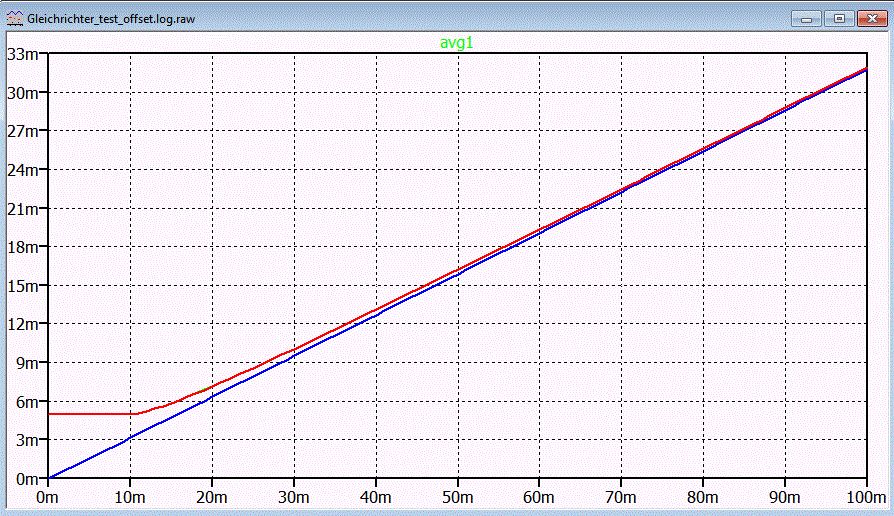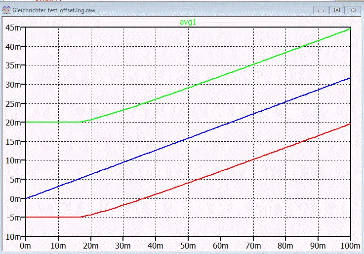 Wenn das Signal eine Offstespannung OF hat, dann gibt es einen Totbereich am Ausgang bis die Eingangsamplitude(x-Achse) größer als die Offsetspannung(10mV) des Sinus ist. Im Beispiel wurde mit -10mV, 0mV und +10mV simuliert. Mit +Offset und -Offset ergibt sich die gleiche Kurve. Deshalb sieht man nur 2 Kurven im Ergebnis.