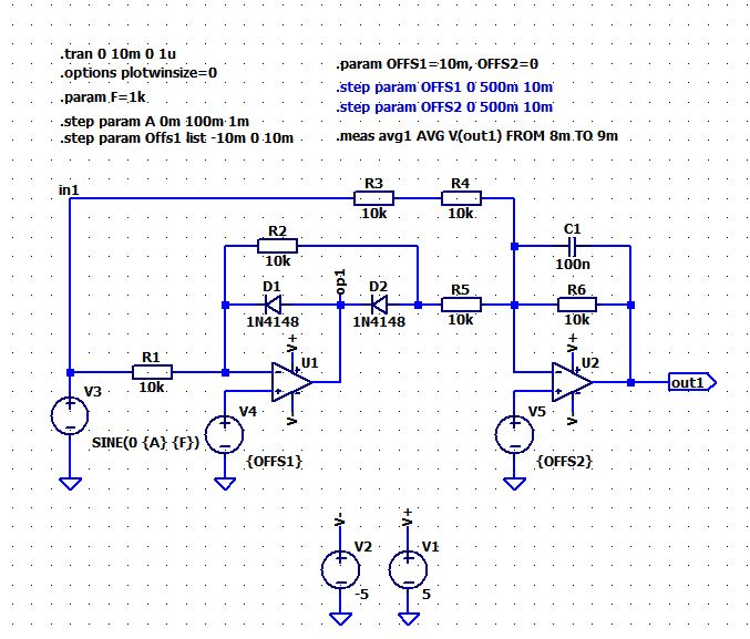 Hab es mal simuliert. Offsetspannung -10mV, 0mV, +10mV am Opamp mit den Dioden. Ich denke man sieht das Problem im Bild - Totbereich bei ganz kleinen Amplituden, wenn der Opamp eine Offsetspannung hat. Die x-Achse ist die Amplitude der Sinus-Eingangsspannung. Farbe: Offsetspannung grün: -10mV blau: 0mV rot: +10mV