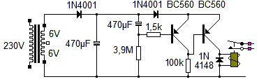 Dirk J. schrieb: > Bei dieser Schaltung Da musst du dich aber mal entscheiden, wie die Speisung und die Transistoren nun gepolt sind. Wenn die Speisung richtig ist, sind die Transistoren falschrum - und umgekehrt. Die Schaltung von Konstantin sieht recht einfach aus, flattert aber mögl. bei Übergang, weil keine Schmitt-Trigger Eigenschaften da sind. Norbert schrieb: > Wenn du möchtest, das bei einem 'High' am Ausgang des 555 das > Relais > abfällt tuts ein PNP Transistor in der Highside des Relais. Die Frage > ist nur, was die LED anzeigen soll. > Wie würde die Schaltung genau aussehen? Emitter des PNP an Plus, Kollektor ans Relais, die andere Seite des Relais an Masse. Basis über einige kOhm (1k-2,2k) an den Ausgang des 555. Wenn die LED leuchten soll bei angezogenem Relais, dann schalte sie an Plus und über Vorwiderstand an den Ausgang des 555.