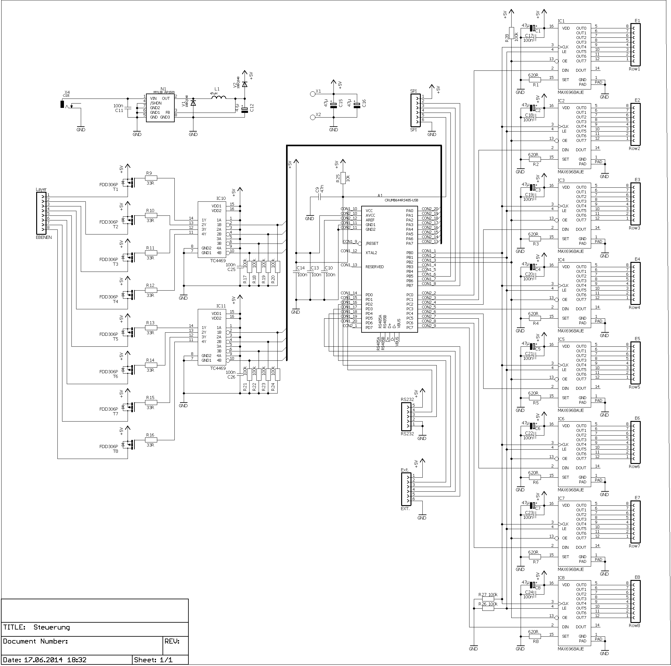 Hallo Leute. Für eine kleine Steuerungseinheit habe ich eine Platine entworfen. Zentraler Punkt der Steuerung ist ein ATmega644p, den ich der Einfachheit halber (hatte ich zu Hause rumliegen) in Form eines Crumb644p verwende. Die Steuereinheit hat also einen Sockel für das Crumb644p-Modul sowie eine eigene Spannungsversorgung, die mittels AP1509 von 12V auf 5V regelt, um die Versorgung zu gewährleisten und damit ich nicht übers Crumb-Modul mittels USB versogen muss. Crumb644p, sowie die Versorgungsschaltung der Steuereiheit funktionieren für sich einwandfrei und haben auch die entsprechenden Pegel. Stecke ich nun den Crumb644p in den vorgesehenen Sockel der Steuereiheit, so bricht die 5V Versogung zusammen und der Buck-Converter beginnt heiß zu laufen. Ich habe die Platine schin mehrfach auf Kurzschlüsse und etwaige andere Fehler geprüft, habe aber leider nicht den entsprechenden Fehler ausmachen können. Danke schonmal in Vorraus für eure Hilfe. LG Martin