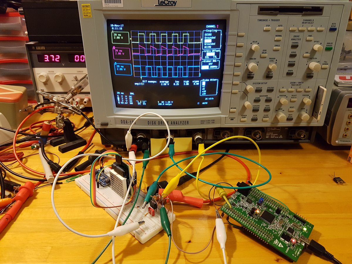 Hallo Leute, für Thread-Neuleser: ich hatte oben eine Schaltungsidee vorgestellt, in der ein NON-Logic MOSFET mit einem einfachen 3,7V Mikrocontroller angesteuert wurde. Das klappt in der o.g. Simulation (vgl. Beitrag "Re: 2A mit Transistor über AtTiny schalten") auch dann noch, wenn die Threshold-Spannung des MOSFETs (leicht) oberhalb der Versorgungsspannung lag. Die Schaltungsidee (vgl. Beitrag "Re: 2A mit Transistor über AtTiny schalten") fand ich selber anschließend so interessant, dass ich unbedingt wissen wollte, ob sie auch in der Praxis funktioniert. Also habe ich in der Grabbelkiste gewühlt und mit dem Vorhandenen eine sehr ähnliche Schaltung aufgebaut. Um Simulation und Realität vergleichen zu können, habe die meine Simulation angepaßt: dort tauchen nun genau diejenigen Bauteile auf, die ich auch in der Realität verwendet habe: Zum einen den IRF1010N an Stelle vom ehemals verwendeten IRFZ44N (beide MOSFETs haben sehr ähnliche Kennwerte). Sodann habe ich einen ARM-Prozessor (STM32F4 auf einem STM32F4-Discovery Board) statt eines ATmega verwendet. Er verträgt nur 25mA am Ausgang, weshalb ich den Widerstand von 100 Ohm auf 220 Ohm vergrößert habe. Etwas trickig war es, die Timer im ARM so zu konfigurieren, dass ich das Signal ausschließlich mit Timern erzeugen kann. Der ARM-Prozessor könnte also 100% seiner Rechenpower auf andere Tätigkeiten verwenden. Und als Last habe ich auch erst einmal nur 1 kOhm verwendet - echte Lastwiderstände passen immer so schlecht in die Löcher vom Steckbrett ... Die Ergebnisse könnt Ihr den Bildern im Anhang entnehmen: Simulation und Realität stimmen gut überein. Will sagen: der Level-Lifter funktioniert wirklich gut (freu, freu). Viele Grüße Igel1