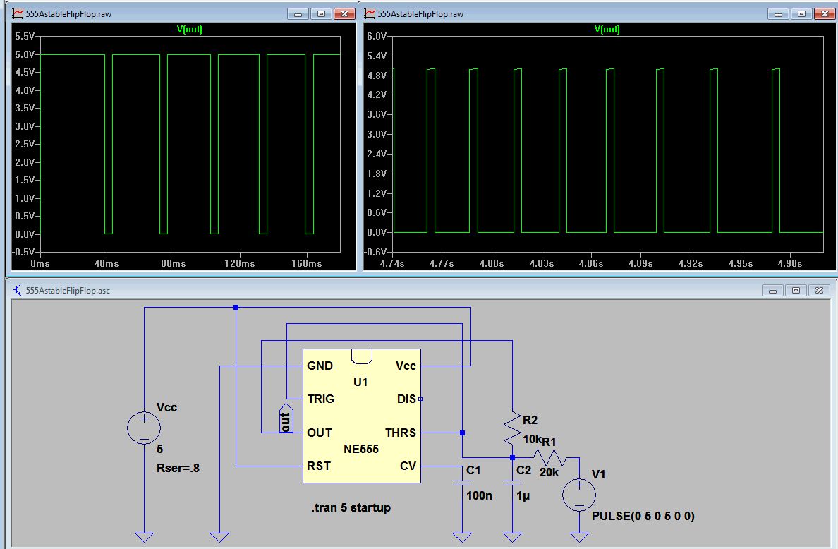 IUnknown schrieb: > aber hier ist meine Version. Hmm, zwar stoppt dieser Oszillaotr auf high wenn das Poti an Messe und auf low wenn das Poti an plus gedreht ist und liefert 50% duty cycle wenn es auf halb steht, aber 1% oder 99% kann er nicht, die PWM setzt schlagartig aus beiden Richtungen mit 10% Tastverhältnis ein. Für sauberes Verhalten ist entweder ein simulierter NE555 :-) oder ein CMOS-555 notwendig, sonst muss man den Ausgangsspannungsverlust des echten NE555 miteinkalkulieren und die 2k eher zu 1k8 machen.
