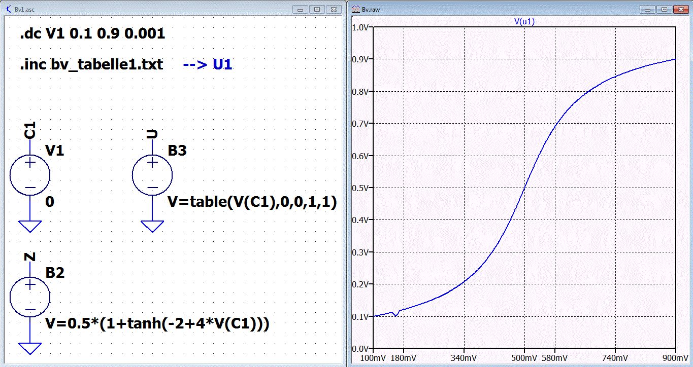 In LTspice kann man mit den Quellen bv und bi Funktionen und Tabellen benutzen. Bv-Quelle mit Tabelle V=table(V(C1),0,0,0.3,0.7,1,1) Bv-Quelle mit Formel V=0.5*(1+tanh(-2+4*V(C1))) Da deine Tabelle sehr lang ist, schreibt man am besten die komplette Bv-Tabelle in eine Datei. Siehe Anhang. BV1 U1 0 V=table(V(C1), + 0.10, 0.100, + 0.11, 0.102, + 0.12, 0.105, + 0.13, 0.107, + 0.14, 0.110, + 0.15, 0.112, .... ) Deine Funktion hat eine Delle bei 0,16. Absicht? Übrigens teilt deine Funktion durch 0 bei einem Eingabewert von 0,5. LTspice bedankt sich da mit Giga-Volt.