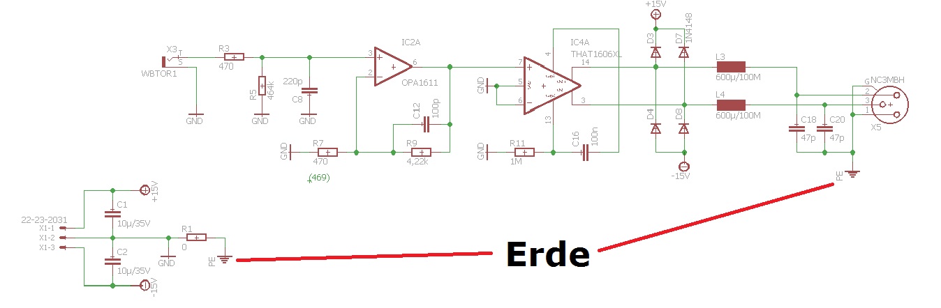 Anton schrieb: > Für ein paar Ratschläge wäre ich dankbar. Schau mal nach - symmetrischer Übertragung - asymmetrischer Übertragung Der Begriff pseudo-differenzielle Übertragung dürfte für Dich auch interessant sein. https://de.wikipedia.org/wiki/Symmetrische_Signal%C3%BCbertragung Hier wird die Brummschleife angesprochen. https://www.delamar.de/faq/symmetrisch-vs-unsymmetrisch-kabel-eingaenge-ausgaenge-8321/ Anbei eine Schaltung die ein asymmetrisches Signal in ein symmetrisches Signal wandelt. Interessant ist, wie bei der XLR - Buchse mit der Erde verfahren wird. Die Signalmasse ist GND. Sie ist nur punktuell mit der Erde verbunden und kann somit nicht gestört werden. mfg klaus