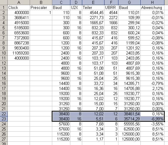 Was nicht weiter verwunderlich ist, ergibt sich doch ohne U2X bei 4MHz und 38400 Baud ein Fehler von etwa -7%, mit U2X aber nur tolerable 0,16% (siehe Tabelle). Gruß Ingo