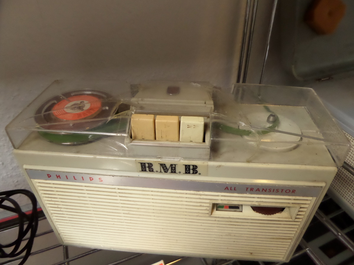 Hi, habe neulich dieses Minitonbandgerät gesehen. Ist von Philips, "All Transistor". R.M.B. sind wahrscheinlich nur die Initialen eines Vorbesitzers. Würde gerne wissen wie die korrekte Gerätebezeichnung lautet. Habe aber nur dieses eine Photo...
