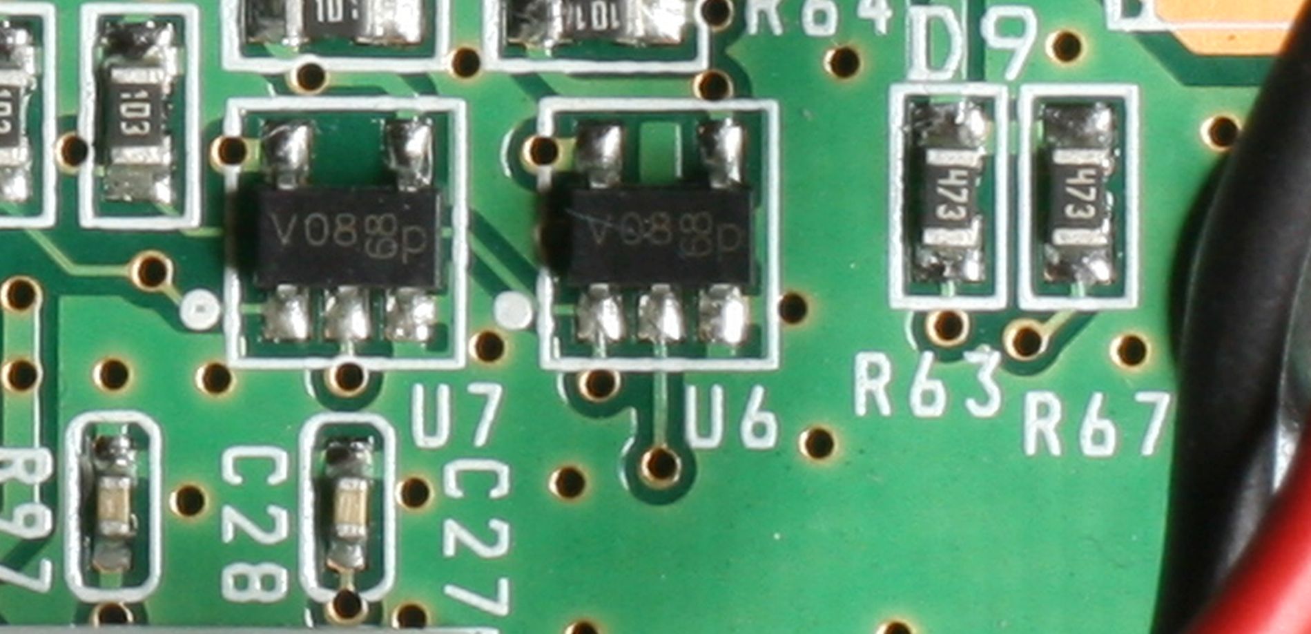 Das sind auf jeden Fall Gate-Treiber für den IRF7103 Dual-N-Channel MOSFET. Hier ist bestimmt noch jemand, der das Kürzel der Bezeichnung V08 kennt. Vermutlich ist der IRF7103 defekt, sonst würden die Gate-Treiber nicht kaputtgehen. Und dann muss man sich noch fragen, warum der IRF7103 defekt ist. Hier dürfte eine mechanische Überlast aufgetreten sein. Was macht der entsprechende Motor, evtl. mal per Netzteil ansteuern. Die MOSFET-Schaltung samt Gate-Treiber deutet auf eine Drehzahl-Variable Funktion hin.