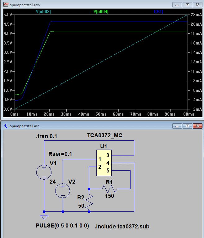 Sehr schön, funktioniert und geht bis 2A, über den typischen Strombegrenzungswert schweigt das Datenblatt sich ja aus. TCA0372 Spice model subckt current limit too low wrong now fixed