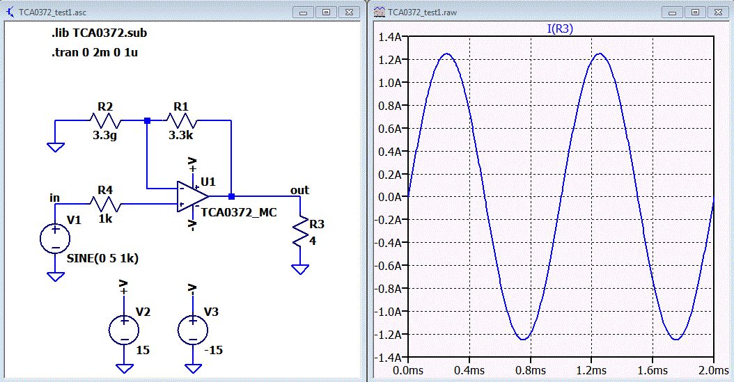 Hi Leute Ich habe ein Problem mit dem PSpice Model von Motorola zum TCA0372 http://espice.ugr.es/espice/src/modelos_subckt/spice_complete/m_opamp.lib Wie man in der Simulation in LTSpice im Bild sieht, begrenzt der OpAmp bei 20.7mA den Ausgangsstrom obwohl es ein 1A OpAmp sein soll. Ich habe keine Ahnung, welche Parameter den maximalen Ausgangsstrom im beigelegten TCA0372.sub definieren, angeblich werden die für das Boyle Macromodel mit einem Programm PARTS erstellt das ich nicht finde (gehört wohl zum kommerziellen PSPice und der Name ist blöd in Google), geschweige denn die Daten die in PARTS eingeflossen sind um den (fehlerhafte) SUBCKT zu erzeugen. Weiss jemand wie man das SUBCKT ändert damit es was taugt oder hat jemand ein anderes (auch L272) ?