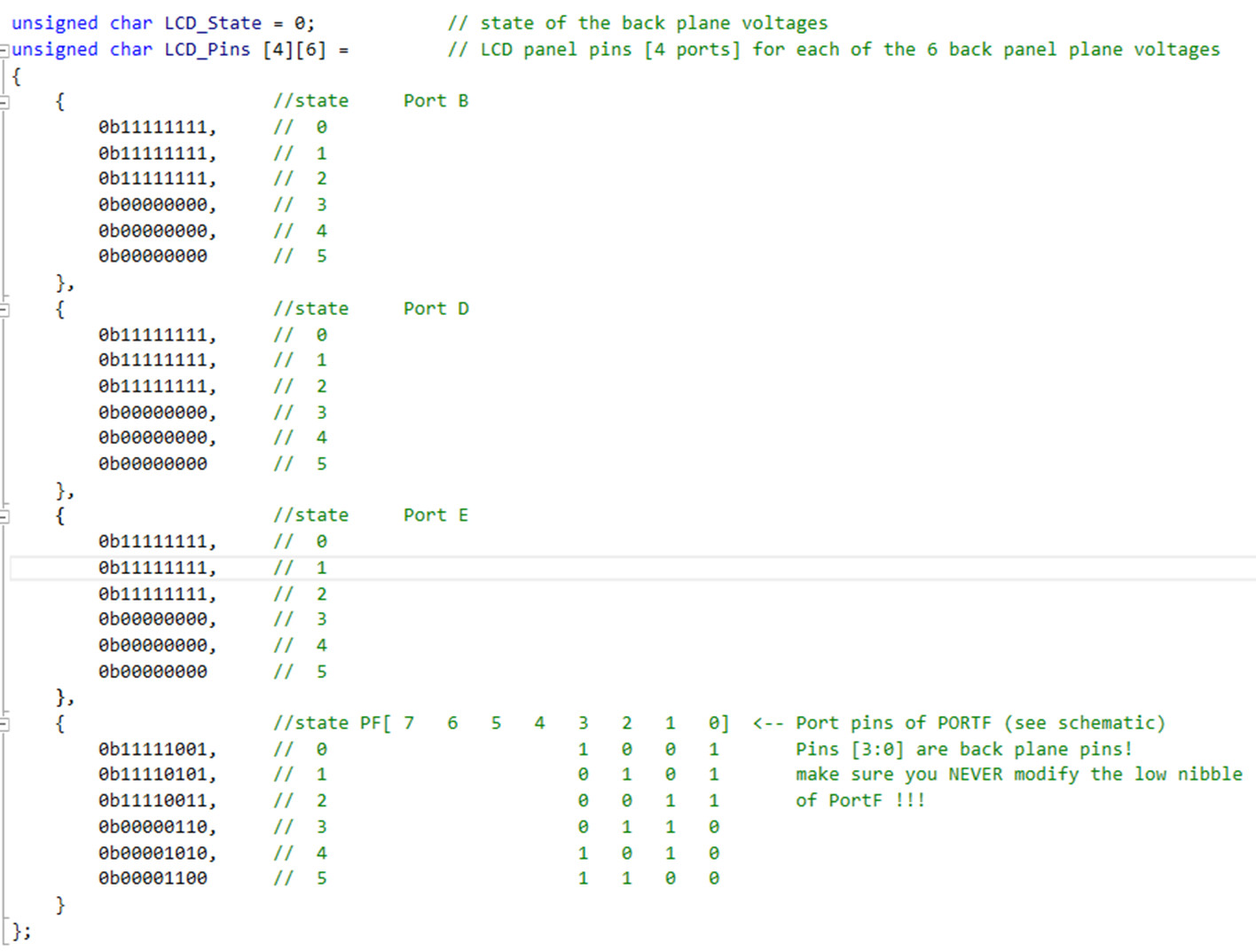Der Schlüssel zum Erfolg lag eigentlich nur an der Erkenntnis, das die 6 Phasen des Taktschemas eigentlich in eine positive und negative Taktung mit je 3 Slots unterteilt werden kann. Die Funktion LCD_Update wird vom Timer per Interrupt alle 5ms aufgerufen. Die globale Variable "LCD_State" zählt von 0 bis 5 durch. Die ersten 3 States gehören der positiven Treiberphase an, die letzten 3 Phasen der negativen. Man muss einfach nur die Pins negieren und kann damit aus einem 3 Bit tiefen Array leben, statt wie zuvor aus einem 6er. Im Array "LCD_Pins" sind jetzt alle Pin für jeden State aufgeführt. Jedes Bit entspricht einem LCD-Element. Jetzt ist die Ansteuerung der Elemente einfach. In der Excel-Tabelle sieht man wie ich den ersten Port "entschlüsselt" habe. Jetzt kann man einfach eine Funktion schreiben, die z.B. eine Zahl auf die 7-Segmente-Anzeige bringt. Vielleicht nutzt die Vorgehensweise jemanden was, ich würde es genau so empfehlen. Viele Grüße! Marko