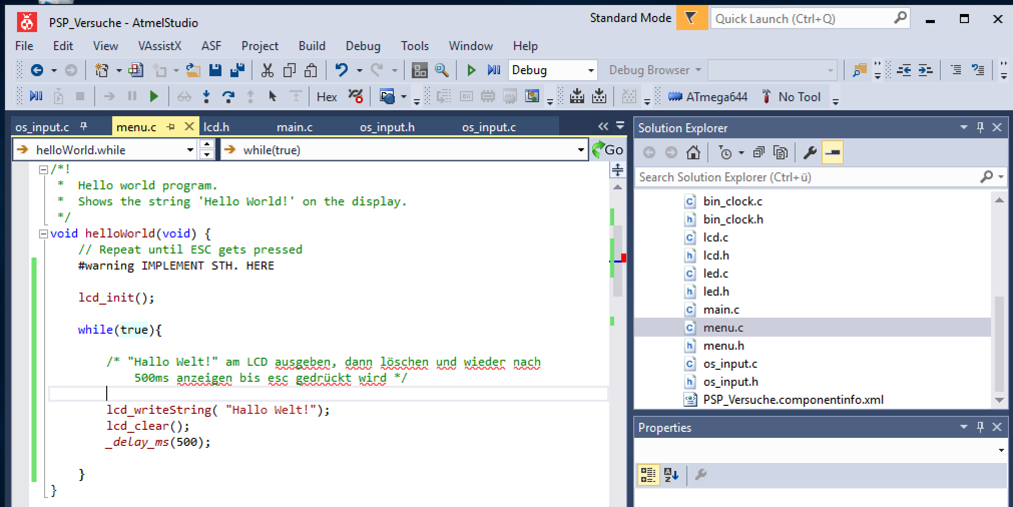 Also meine ganze Aufgabe lautet dass ich eine Zeichenkette auf dem LCD Display in 500ms Abständen ausgeben, solange bis der ESC-Button gedrückt worden ist.