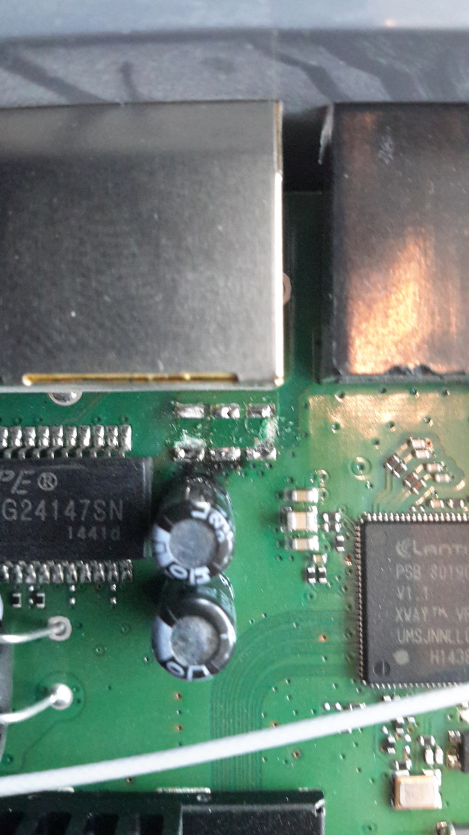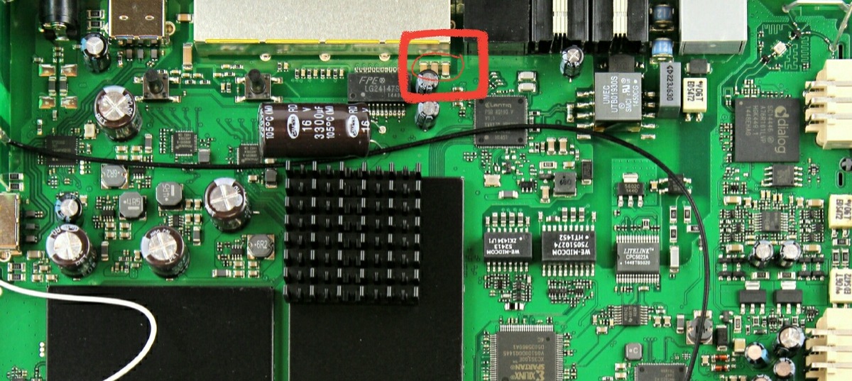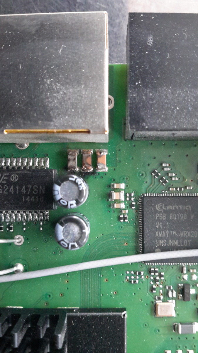 Diese Kondis sind für die Entstörung der Ethernet-Anschlüsse. Mit Analogtelefonie hat das nichts zu tun. Wird halt irgendwas durch Überspannung gestorben sein. Ist der mickrige Kühlkörper eigentlich original drauf?