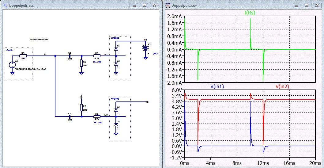 Hallo! Ich brauche ein Differenzierglied, welches sowohl auf eine steigende als auch auf eine fallende Flanke (eines digitalen/Rechteck-Signals) mit einem positiven Impuls antwortet. Typischerweise gibt so ein DG einen positiven Impuls auf eine steigende Flanke und einen negativen Impuls auf eine fallende Flanke. Beitrag "Re: NPN Transistor durchsteuern wenn Basis an GND" Vorgabe: wenige Bauteile, diskreter Aufbau ohne IC+Mikrocontroller. Die Lösung eines Tiefpasses (im Gegensatz zu einem Hochpass=DG) für die fallende Flanke bringt nicht das gewünschte Ergebnis, siehe Bild. Denn der Tiefpass antwortet mit einer negativen Flanke auf eine negative Flanke, siehe Bild. Ich habe auch über eine Negation des negativen Impulses mittels einer normalen npn-Emitterschaltung nachgedacht, nur scheint dieses den Impuls zu verzerren. Hat da jemand eine Idee?