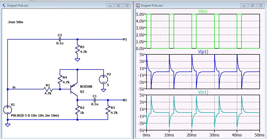Moin, Ok, aus der Abteilung: Halloween-Horror-Logik oder "so-soll-mans-nicht-machen" kann ich noch die Schaltung beisteuern. Macht exakt das, was im Ausgangspost beschrieben wurde: Bei steigender und fallender Flanke des Eingangssignals gibts am Ausgang je einen positiven Impuls. Die Basiswiderstaende werden unterschiedlich gross sein, um gleich lange Impulse fuer steigend/fallend zu erreichen. Aber nochmal: Wer solche Schaltungen verwendet, tut sich echt keinen Gefallen. Gruss WK
