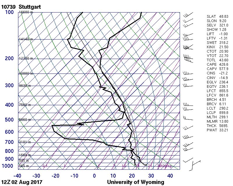 Max M. schrieb: > Kühlere Luft könnte noch sein? Hmm aber warum fiel das im Winter dann > nie auf? Das könnte durchaus ein Grund sein. https://de.wikipedia.org/wiki/Schallausbreitung#Brechung_.28Refraktion.29 Ich stelle mir das so vor: Der Schall des Flugzeuges trifft relativ großflächig auf den Boden und wird dort reflektiert. Bei nicht vorhandener oder höher liegender Inversion erreicht den Beobachter nur der Direktschall. Bei niedrig liegender Inversion (in Stuttgart heute bei ca. 1500m), wird ein Teil des vom Boden reflektierten Schalles an der Inversionsschicht in Richtung des Beobachters zurückgelenkt. Kannst ja mal gucken, ob du einen Zusammenhang zwischen Inversionsschicht und deinen akkustischen Beobachtungen herstellen kannst. Sondendaten (mit Archiv) gibt es hier: http://weather.uwyo.edu/upperair/europe.html Die linke Linie ist der Taupunkt, die rechte die Temperatur (und wo sich beide berühren sind die Wolken ;-). Die Stuttgarter Station (Schnarrenberg) hat die Nummer 10739 Oder hier (nur 2-3 Tage): https://www.wetteronline.de/radiosonden/europa