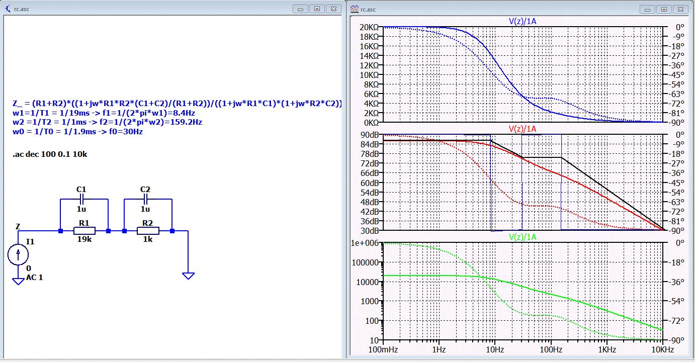 Hallo Paul, Hier die einfachst mögliche Schaltung zur Impedanzmessung. Einfach einen Konstantstrom einprägen. Die Spannung ist dann proportional zur Impedanz. Im Bodediagramm habe ich Betrag und Phase konstruiert (schwarze und blaue Kurve). In dem Beispiel hat das Bodediagramm die Frequenz auf der x-Achse. Mit einem "Trick" könnte man auch über die Kreisfrequenz simulieren und plotten. Speziell in der Regelungstechnik wäre das die übliche Darstellung. Gruß Helmut PS: ein rc.plt ist zuviel. Kann es aber nicht löschen.