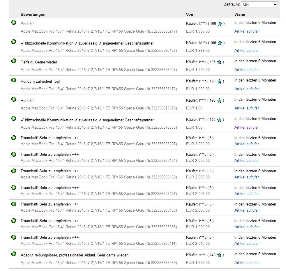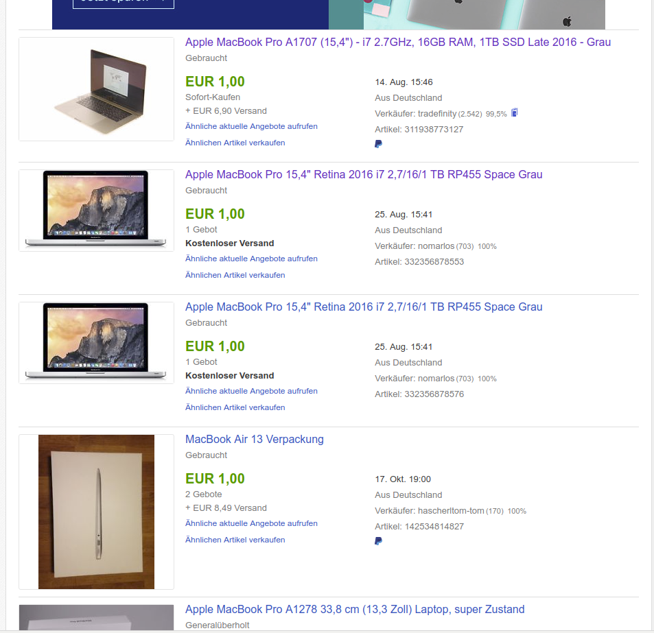 Hallo, ich habe einmal nach beendete eBay-Angebote für MacBooks geschaut und gesehen, dass davon viele für 1 € Sofort-Kaufen verschenkt werden: https://www.ebay.de/sch/i.html?_from=R40&_sacat=0&_nkw=macbook&LH_Complete=1&rt=nc&_trksid=p2045573.m1684 Anbei noch einmal als Screenshot festgehalten, falls der Link nicht geht. OK, die Geräte sind zwar von Ende 2016, also für Apple-Verhältnisse völlig veraltet, aber 1 € erscheint mir doch etwas wenig. Woher kommen diese Angebote? Hat der Händler da einen eingeschränkten Käuferkreis auf eine Person (er selbst) eingestellt und dann für 1 € gehandelt, um ganz vorn zu stehen? Oder ist das irgend ein anderer Trick dahinter?