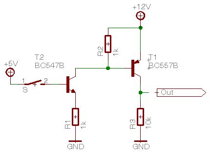 @Läubi: Meinst du die Schaltung von Sebastian? Da wird eine PNP benutzt. Der sperrt in dieser Schaltung nur komplett, wenn die Basis auf +12V liegt. Ein diskreter Open-Kollektor invertiert in der Regel (jaja, und während dieser Zeit kann man auch mit einem Tampon schreiben...).