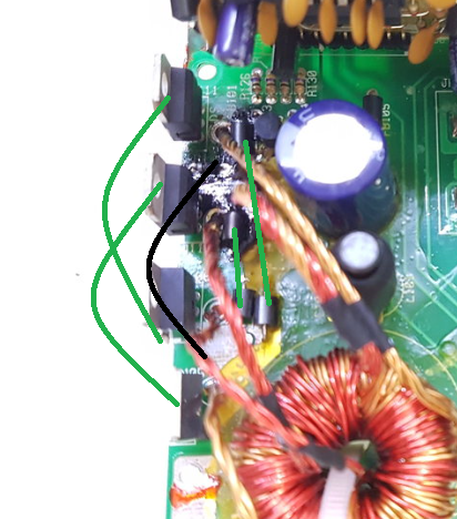 Vorher könnten wir noch etwas helfen. Wenn wir Glück haben ist noch eine zweite Endstufe mit den gleichen Bauteilen verbaut. In der Schaltung ist auch ein Widerstand verbrannt. Irgendwo im Bereich des anderen Paares könnte noch ein Zweiter sein, (schwarze Linie) bei dem die Farben erkennbar sind. Auf den Gehäusen der Mosfets ist die Typbezeichnung aufgedruckt. (grüne Linien).