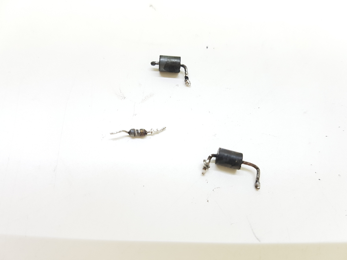 Bevor Du das Ding wegschmeißt schicke ich Dir meine Adresse und erstatte Dir den Versand. Da sind viele Teile drin, die ich regemäßig mal brauche. Da ist das Netzteil gestorben, entweder zu heiß geworden oder ein Problem mit der Stromversorgung. Die beiden FETs sind mit Sicherheit tot, der Widerstand ist einer der Gate-Widerstände, daher hat vermutlich auch die Treiberschaltung gut in die Fresse bekommen. Die FBs sind als Opfer gestorben, der Querschnitt des verwendeten Drahtes war nicht hoch genug für die vielen Ampere, die da nach dem Durchlegieren der FETs durch wollten bis die (eventuell gar nicht vorhandene?) Sicherung kam.