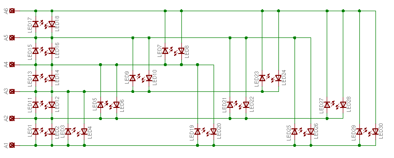 Gibt es für ein Lauflicht, bei dem jede LED einzeln angesteuert werden soll, eine effektivere Variante als die im Anhang (mit weniger einzelnen Kabeln)? Bei der Variante im Anhang kann ich doch per PWM und mit Gegentaktendstufen jede LED einzeln zum leuchten bringen, oder hab ich was übersehen? MfG, Bri