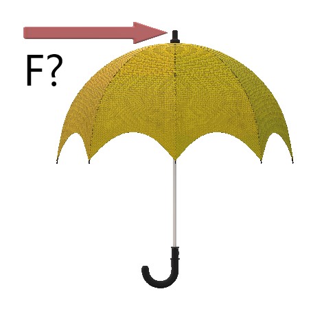 Warum genau möchte man dieses Detail unbedingt wissen? Der Regenschirm sollte auf alle Fälle stabil genug konstruiert sein. Außerdem ist die Frage äußerst ungenau gehalten. Wie sind die Abmessungen des Schirms? Wie hoch ist die Windgeschwindigkeit? Ist der Wind turbulent oder laminar? Warum mietet der Fragesteller nicht einen Windkanal so lange, bis er die Kraft messen konnte? Möchte er, daß jemand anderes die Messung macht? Warum frägt er nicht nach der Bedingung für das Umklappen des Schirmes nach oben? Ist der Fragesteller überhaupt imstande, die Frage zu präzisieren? MfG