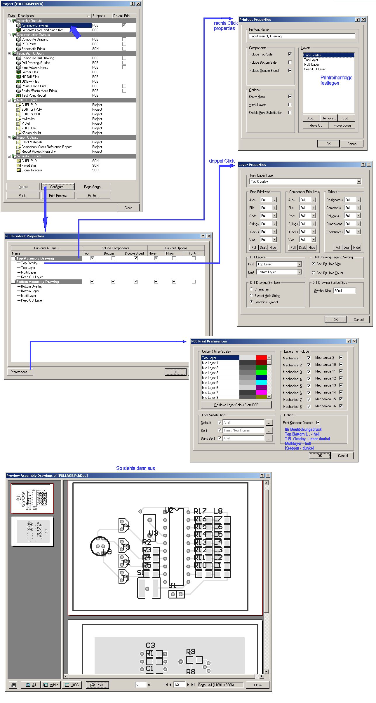 Hallo Da ich gehört habe, dass Altium Bestückungspläne oft schlecht lesbar sind habe ich eine Anleitung geschrieben um den Grauwert(ganz schwarz auch) einzustellen. Drei Schritte sind notwendig.(Step1 bis Step3) Im Anhang findet man 3 Fotos mit Bezug auf Step1 bis Step3. Step1: Im Job-File die "Assembly Drawings"-Zeile markieren und mit rechter Maustaste und Configure... öffnet sich das "PCB Printout Properties" - Fenster. Step2: In diesem Fenster die "Top Overlay"-Zeile markieren und mit rechter Maustaste und Preferences... öffnet sich das "PCB Print Preferences" - Fenster. Step3: In diesem Fenster unter Colors & Gray Scale die Zeile "Top Overlay" markieren und den gewünschten Grauwert auswählen. mfg Mike