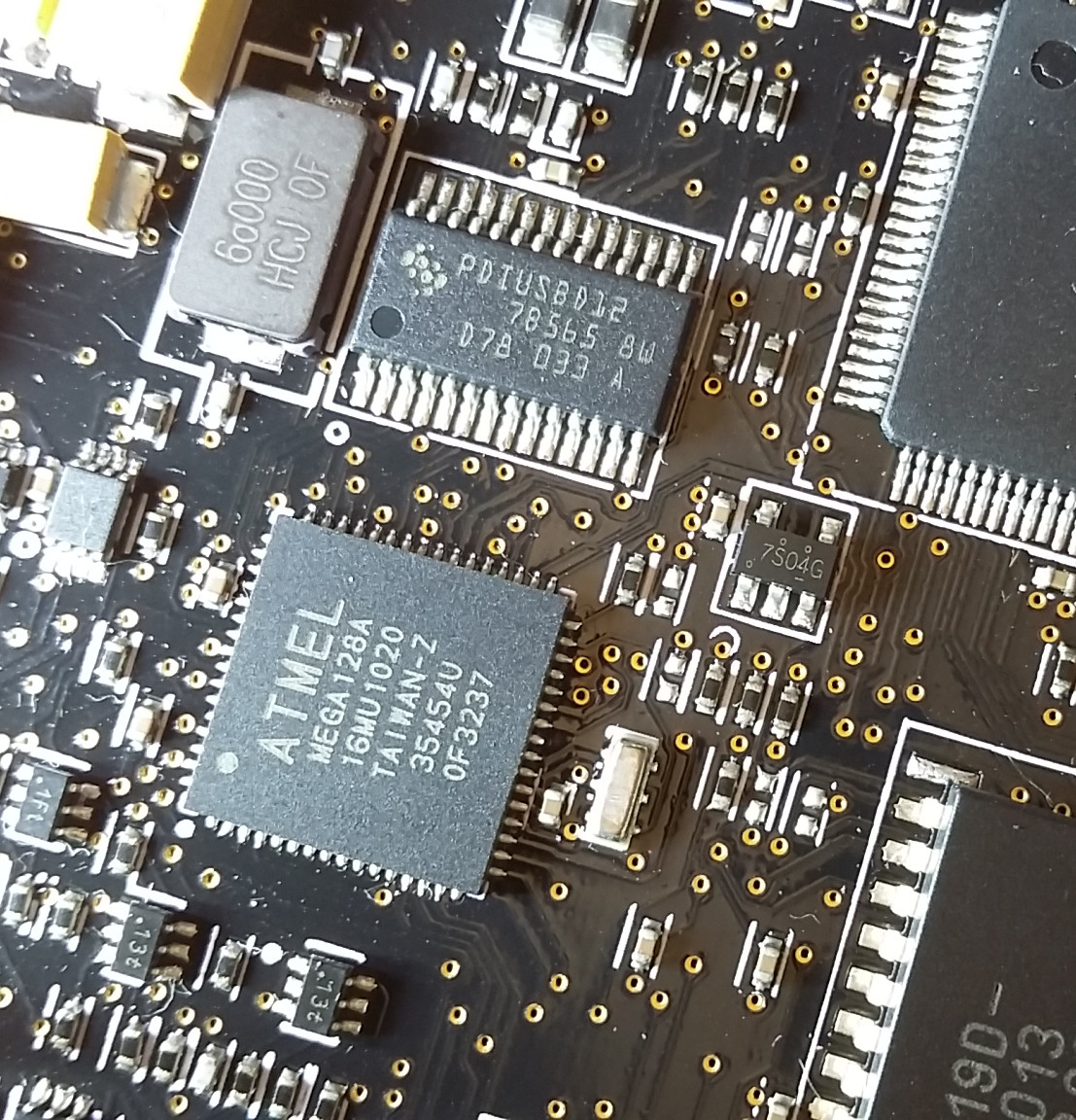 Hallo zusammen, @Dennis Danke für die Links! Solche Posts hatte ich eigentlich erhofft :-) Ich habe mich mit meiner Uhrmacherlupe und nem Scope mal auf die Suche gemacht und ein SOT23-5 Bauteil gefunden, das eine leichte Wölbung hat. Leider kann ich das Marking nicht entziffern. Es scheint mit "7S.." zu beginnen. Der Rest ist nicht lesbar. Wenn der USB Anschluss Oben, also von einem wegzeigt, befindet sich in der Mitte der Platine ein ATMEGA128 im QFN Package. Das besagte Bauteil ist auf ca. 1Uhr vom MEGA128 aus. Das SOT23-5 hat dann oben 2 Pins und unten 3 Pins. An den oberen beiden kann ich 5V messen. Hat jemand eine Idee was das für ein Ding ist? Bei einem LDO hätte ich nicht 5V an den oberen Pins erwartet. Gruß Florian