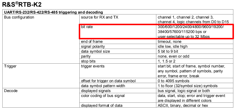 Danish B. schrieb: > Im Datenblatt konnte ich bezüglich der max. Baudrate nichts finden. Ehrlich jetzt? http://cdn1.shop.rohde-schwarz.com/media/catalog/product/R/T/RTB2000_dat-sw_en_3607-4270-22_v0400_96dpi_1.pdf auf Seite 14: "UART/RS232/RS422/RS485 triggering and decoding: ... bitrate 300/600/.... or user - selectable up to 3 Mbps"