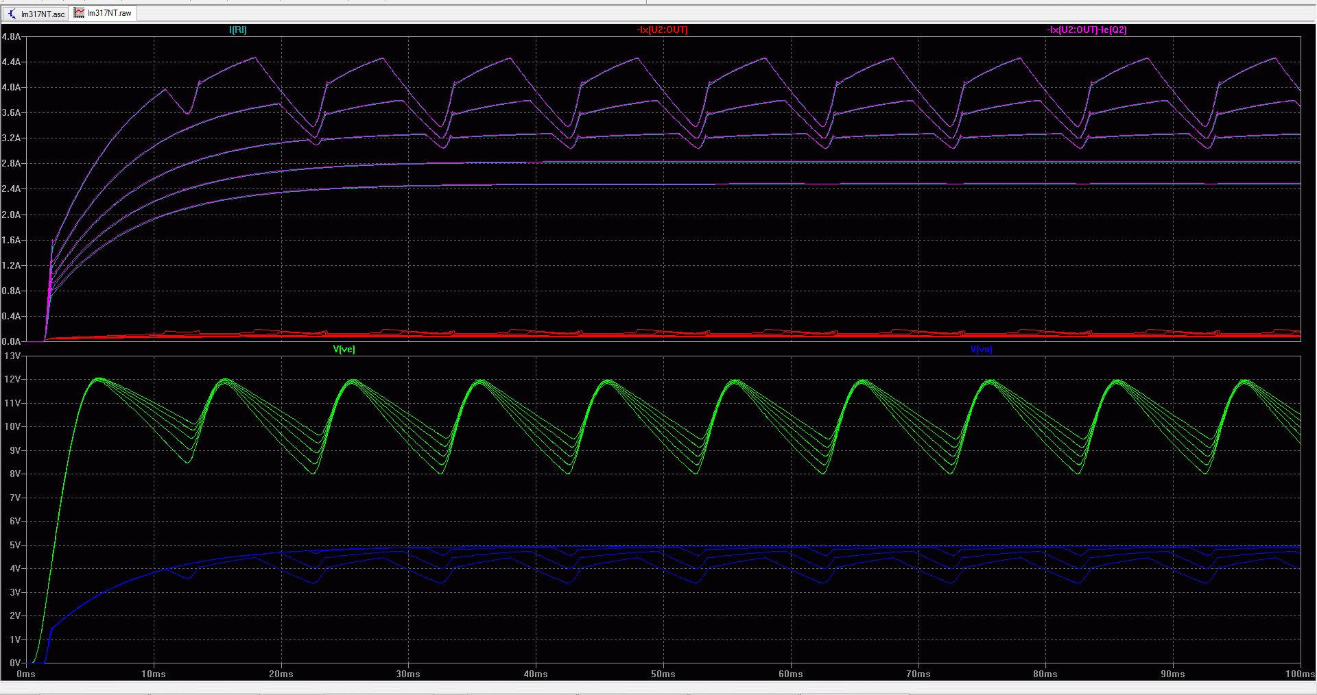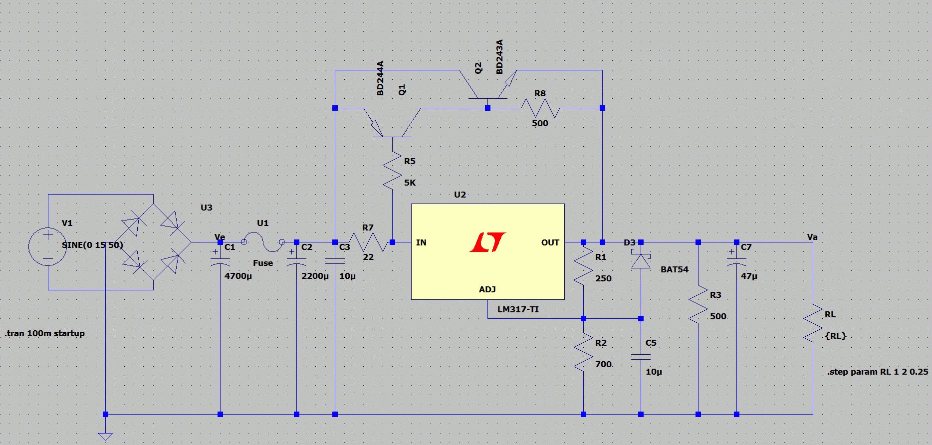 Michael M. schrieb: > Leo schrieb: >> Aber den Überstrom- und Übertemperaturschutz hast du damit auch nicht. > > Richtig. Das komplette Sicherheitspaket fällt damit selbstverständlich > vollständig weg. Unter dieser Maßgabe habe ich zur Vervollständigung des threads mal Schaltung und Simulation beigefügt. Wobei ich die Ua auf 5V eingestellt habe, aber das lässt sich ja über das R1/R2-Verhältnis anpassen. Die Sicherung U1 soll ein PTC (z.B. PFRA300) sein, hab kein Modell dafür gefunden. Der maximale Ausgangsstrom ist auf 2.8A begrenzt, ohne noch einen ripple auf der Ua zu haben. Um diesen Strom zu erreichen ist eine Eingangsspannung von 15V AC vor dem Brückengleichrichter notwendig, 12V reichen nicht. Man kann den Ausgangsstrom (ohne ripple) noch erhöhen in dem man die Eingangsspannung Ve durch einen noch größeren C1 stützt, allerdings muss der Trafo und die Brücke die Stromspitze auch leisten können. Ist dies so richtig und gibts da nochwas zu ergänzen?