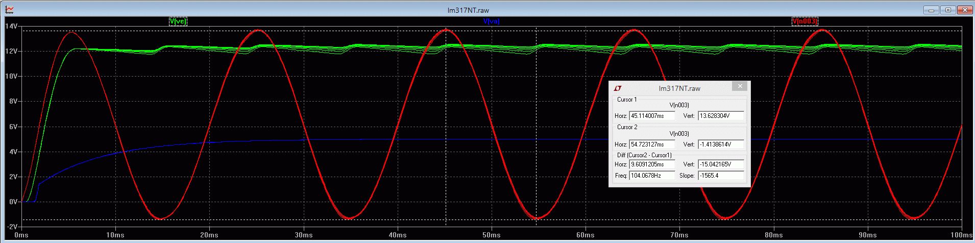 Der Andere schrieb: > Mike B. schrieb: >> Sag blos kein Wort zuviel, wir könnten in Erkenntnis ersaufen! > > Vpp geht vom negativen bis zum positiven Maximalwert. > Das heisst Spitzenspannung zum Mittelwert ist genau die Hälfte. Und RMS > bei Sinus davon dann 1/1,41. > Also 15Vpp -> 7,5Vp -> 5,3Veff Wenn der Ausgang nur schwach mit wenigen hundert mA belastet wird stellt sich eine Ve (Spannung hinter der Brücke) von ~12,35V DC ein, wobei die Eingangsspannung von 15V AC durch die Brückenschaltung um so ziemlich genau Wurzel(2)= 1,41V ins Negative verschoben wird. Siehe Bild. @MaWin Meine Spannungsquelle V1 ist mit Sine(0 15 50) definiert und bringt trotz nur eine Amplitude von 0-15V, bzw. wie beschrieben einen um 1,41V nach unten verschobenen Sinus. Du meintest sicherlich die Einstellung der V1 mit der AC-Amplitude von 15V. @Achim Ich hab nich damit angefangen Vpp usw. durcheinander zu würfeln... ;)