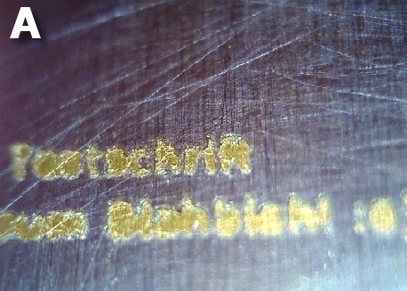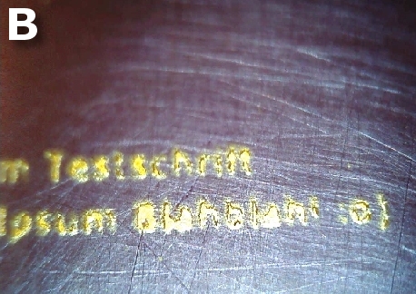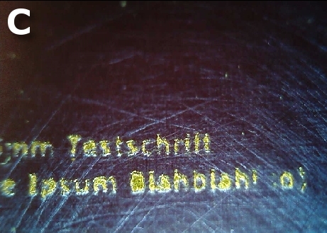 Mir passiert es immer wieder (eigentlich eher: jedes mal), dass die sehr feinen Strukturen (sehr dünne Linien, nahe beieinander) Anzeichen von Überbelichtung zeigen (zumindest, was ich dafür halte: "grieselige" Ränder bzw. Linien, sowie ein dünner werden der Linien bzw. Flächen), während die gröbere Strukturen desselben Werkstücks wiederum noch gar nicht optimal belichtet sind, d.h. es fehlen noch Details, Feinheiten etc. Ist das normal, dass auf ein und demselben Werkstück feine Strukturen viel schneller bzw. früher überbelichten, als die "gröberen" bzw. größeren Zeichnungen? Oder mache ich da vielleicht etwas falsch? Muss man da einen Kompromiss finden, so etwas wie eine "mittlere" Belichtungszeit, mit deren Insgesamt-Ergebnis man eben leben kann? Gerade sehr feine Strukturen (0,5mm große Schrift usw. - was doch eigentlich noch gar nicht zu fein sein sollte) kriege ich nie optimal hin - entweder sind diese unterbelichtet (klare Ränder, aber geringe Detail-Ausprägung) oder überbelichtet (hohe Detailausprägung, aber grieselige Ränder und schmaler werdende Flächen, siehe Bilder). Ich habe es jetzt schon mit allen möglichen Lichtquellen, -Abständen, -Zeiten etc. versucht, es ist wirklich immer dasselbe. :-\ Als Bilder Beispiele, was ich für jeweils Unterbelichtet (Bild A) und Überbelichtet (Bilder B und C) halte.